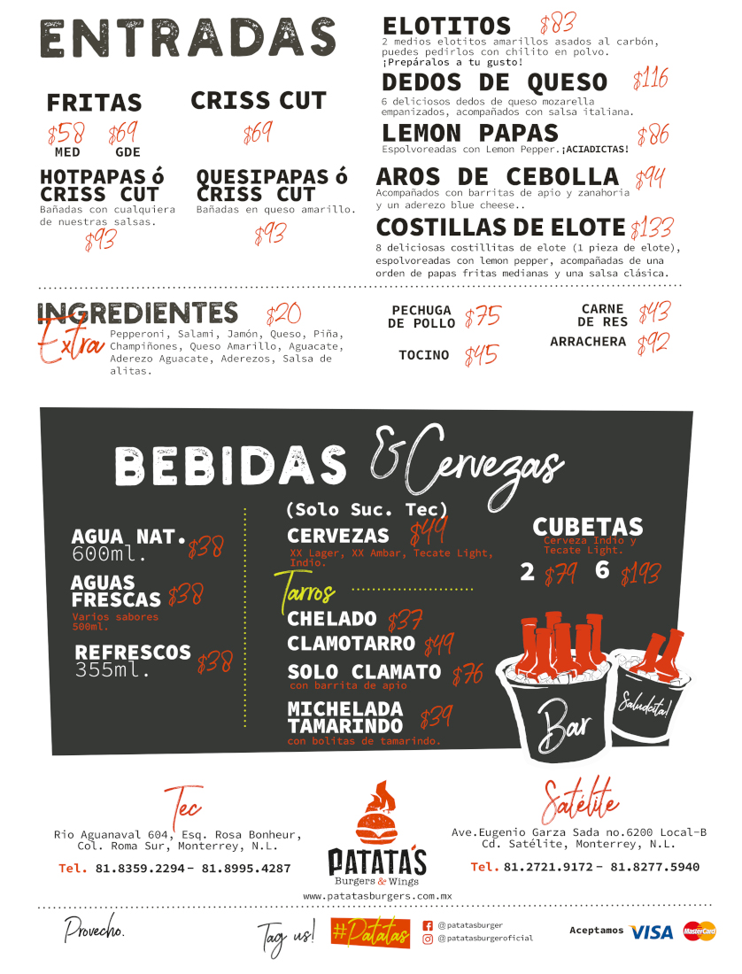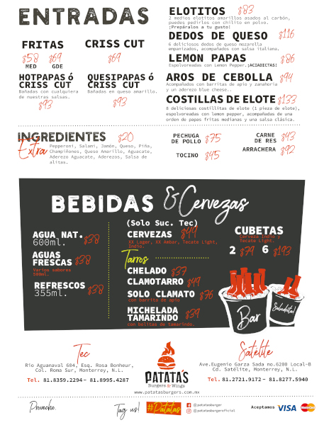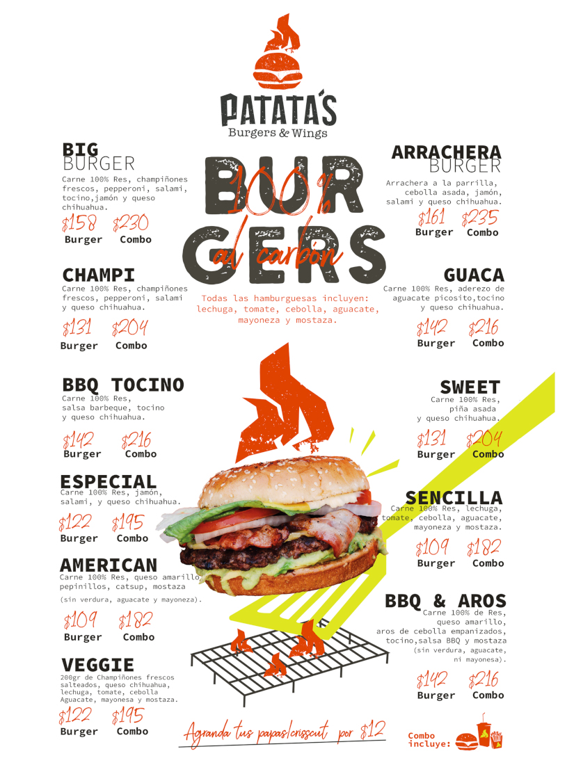 Todo comenzo en una pequeña cabaña dentro de un terreno baldio a principios de noviembre del año 2003, bajo el nombre de “lechugas”, con el objetivo de ofrecer la mejor hamburguesa al carbón de la zona, ubicada en la colonia Roma sur en Monterrey, Nuevo León. En el año 2005 se inicia una etapa de reestructuración cambiando su nombre a “Patata’s Burger”. Apartir del año 2015 evoluciona a Patata’s Burgers & Wings, iniciando un proceso de innovación y desarrollo de imagen corporativa, buscando asi que nuestros clientes disfruten de una mejor experiencia Patata’s en todos los sentidos.