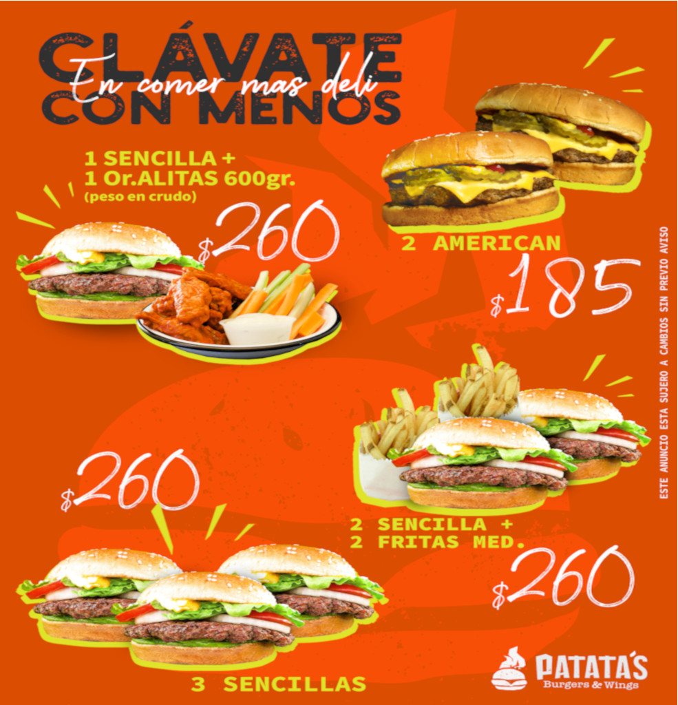 En el año 2005 se inicia una etapa de reestructuracion cambiando su nombre a “patata’s burger”. Apartir del año 2015 evoluciona a patata’s burgers & wings, iniciando un proceso de innovación y desarrollo de imagen corporativa, buscando asi que nuestros clientes disfruten de una mejor experiencia patata’s en todos los sentidos.